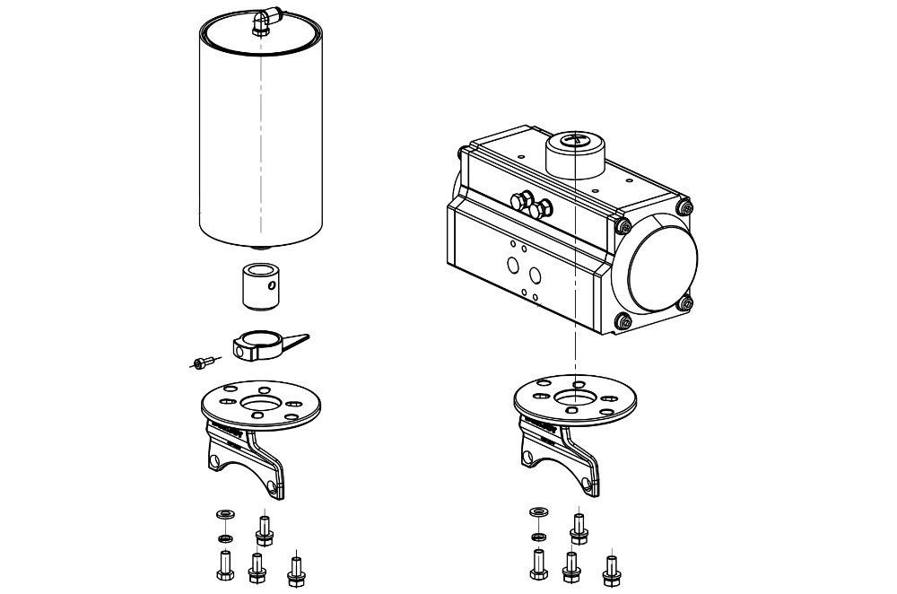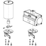 Готовый комплект для установки пневмопривода на дисковый затвор состоит из следующих деталей:
