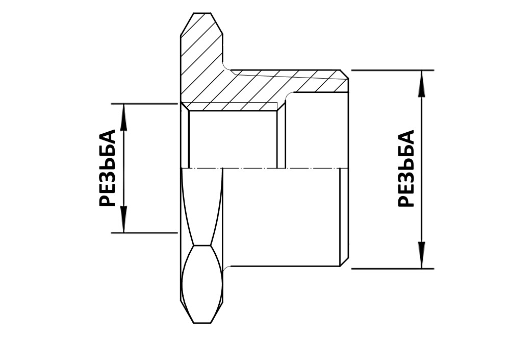 Пример обозначения: Футорка НР-ВР DN-25 х DN-15 (1″ x 1/2″) AISI316. Где, НР-ВР — переход с наружной резьбы (НР) на внутреннюю (ВР), DN-25 х DN-15 — переход с одного условного прохода фитинга на другой в мм., 1″ x 1/2″ — переход с одного размера резьбы на другой в дюймах, AISI316 — марка стали.