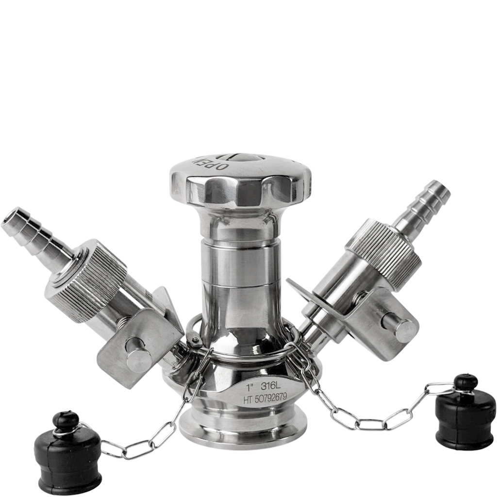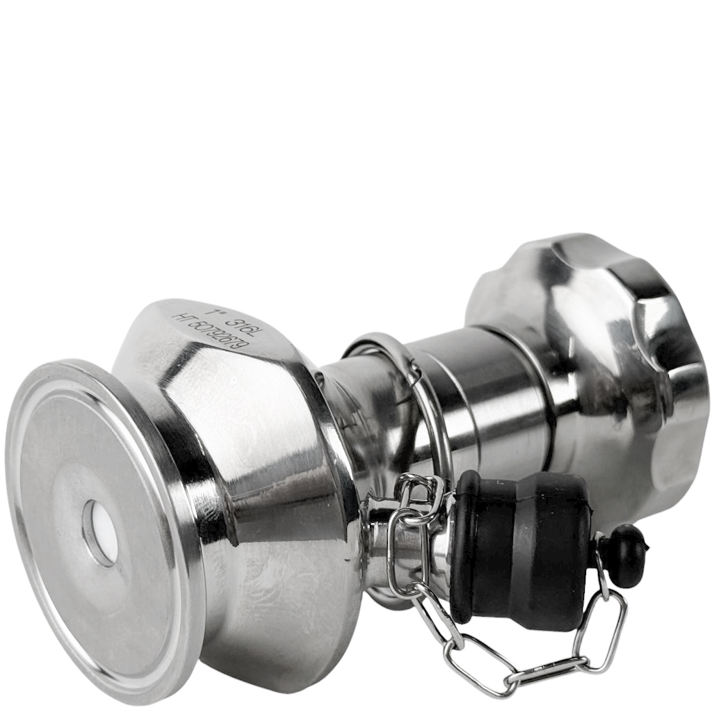 Компания ГРОССНЕР предлагает из наличия асептический пробоотборный клапан с ручкой плавного открытия, присоединением к емкости через кламп (tri-clamp) и портами типа быстросъем под насадки. Клапан выполнен из кислотостойкой нержавеющей стали AISI 316L.