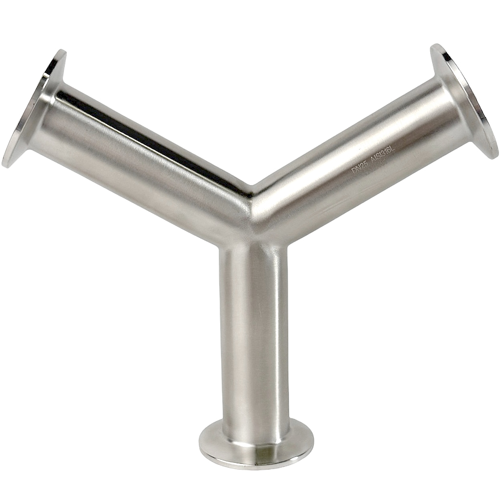 Кламповый тройник Y-типа 120 градусов представляет собой элемент крепежа трубопровода со штуцерами с трех сторон. Это незаменимая деталь при работе в различных средах: горячая и холодная вода, воздух, спирт, пищевые продукты, косметика, фармацевтика, масла, газы.